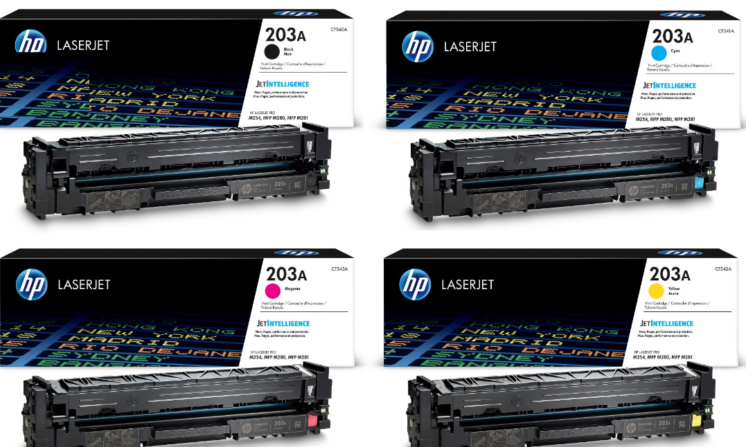 ست کارتریج HP203A (CF540-CF541-CF542-CF543)  یکی از محصولات اصلی شرکت اچ‌پی است که برای چاپگرهای لیزری طراحی شده و به دلیل کیفیت بالا، عملکرد قابل اعتماد، و سازگاری با چاپگرهای HP M254nw, M254dw, M280nw, M281fdw, M281fdn محبوبیت زیادی دارد. بطور میانگین از لحاظ ظزفیت چاپ کارتریج HP 203A مشکی قادر است تا حدود 1400 صفحه و هر یک از کارتریج های رنگی دیگر تا حدود 1300 صفحه را چاپ نماید. کارکرد کارتریج بر حسب چاپ 5 درصد روی کل کاغذ A4 در نظر گرفته ‌شده.